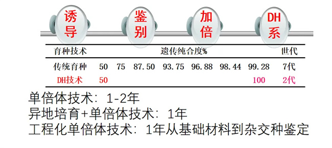那么為了創(chuàng)制優(yōu)良的雜交組合,保證種子優(yōu)勢(shì)性狀的穩(wěn)定性,就要選育高度穩(wěn)定的父母本純系,簡(jiǎn)單理解就是通過(guò)不斷自交或者回交,以使得父母本身的純合度提高,這個(gè)過(guò)程也叫創(chuàng)制純系。利用傳統(tǒng)創(chuàng)制純系的方法需要8代,而單倍體只需要2代的時(shí)間,育種時(shí)間至少節(jié)約2-3年,相當(dāng)于單倍體技術(shù)讓作物育種“坐上高鐵”。陳紹江老師表示,如果利用全套工程化單倍體技術(shù),周年化DH系創(chuàng)制模式,一年內(nèi)即可實(shí)現(xiàn)從基礎(chǔ)材料到純系再到雜交種測(cè)配評(píng)價(jià)的“高鐵式”快速育種模式。為此,陳紹江老師團(tuán)隊(duì)根據(jù)每年育種單位多集中在海南三亞開展南繁的情況,提出并創(chuàng)建單倍體育種工程化平臺(tái),實(shí)施技術(shù)“自助共享”工程化方案,提供從誘導(dǎo),鑒別,到加倍,單倍體育種的全流程解決方案。