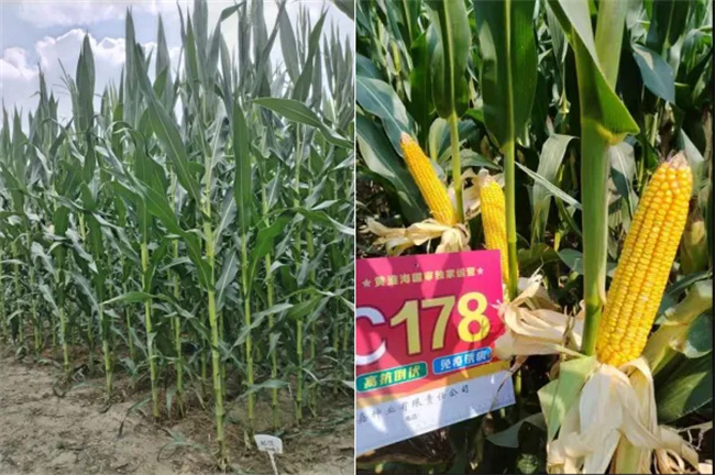 MC178——紅軸大穗品種,北京農(nóng)林科學(xué)院最新國審,生育期102天,株高2.75米,穗位96厘米,穗長22-25厘米,穗行數(shù)16-18行;容重762g/L,出籽率91.2%,軸細粒深;雄穗分支10-15個,花粉量大,授粉結(jié)實性好;高抗倒伏;種植密度彈性大,4000-5500株/畝,增產(chǎn)潛力大。