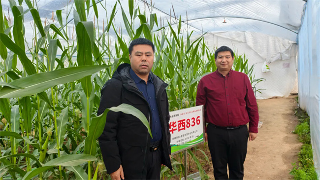 林彥彬一行首先參觀加代種植玉米大棚,聽取了基地負(fù)責(zé)人對華西836生長情況的介紹,尤其對技術(shù)老師發(fā)現(xiàn)華西836的環(huán)境鈍感能力強(qiáng)這一特性表示大加贊賞。