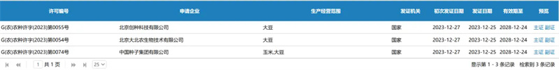 以下3家企業(yè)可進行轉(zhuǎn)基因大豆品種生產(chǎn)經(jīng)營: