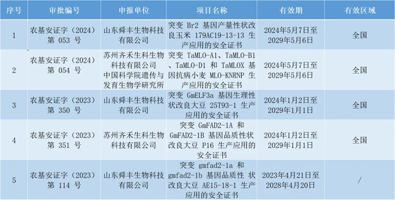 值得注意的是,2024年基因編輯育種進一步開放。目前我國已有5個基因編輯生物安全證書獲批,涉及大豆、玉米、小麥三個農(nóng)作物。