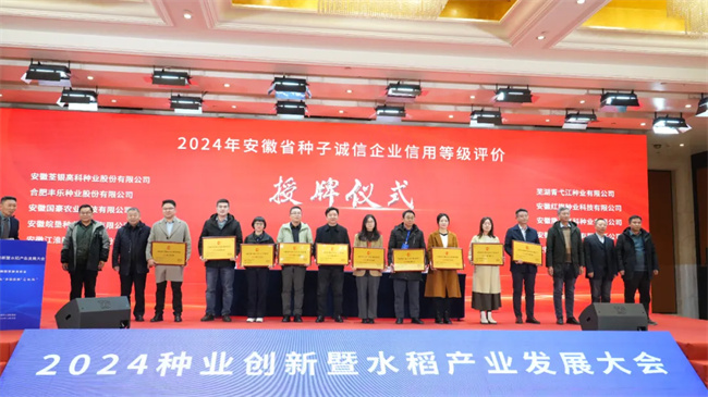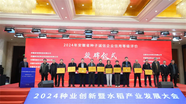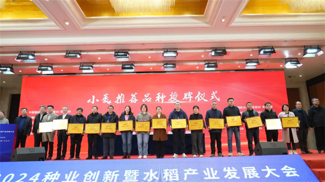 為推進(jìn)農(nóng)作物育種成果轉(zhuǎn)化,加快高產(chǎn)、優(yōu)質(zhì)、綠色、高效農(nóng)作物新品種推廣應(yīng)用。會上,安徽省農(nóng)科院副院長李澤福宣讀2023-2024年度、2024年安徽省農(nóng)作物新品種展示示范“推薦品種”名單,并進(jìn)行推薦品種授牌儀式。通過專家組綜合評定,最終,15個小麥品種,25個水稻品種(其中秈稻20個、粳稻5個),10個玉米品種,5個大豆品種獲“推薦品種”。名單如下:1、小麥推薦品種:中原國科15號、皖墾麥66、安農(nóng)188、大地1087、綠雨1102、安科1907、安科1803、皖宿21、安農(nóng)197、濉1615、皖農(nóng)398、天益科麥10號、皖麥818、富麥999、谷神麥19;2、水稻推薦品種:秈稻品種:荃兩優(yōu)6019、豪兩優(yōu)9918、噸兩優(yōu)818、兩優(yōu)262、安兩優(yōu)676、緣兩優(yōu)晶絲、荃兩優(yōu)985、華浙優(yōu)鈺禾、珍兩優(yōu)17、徽兩優(yōu)16、多兩優(yōu)香絲占、天兩優(yōu)6356、太兩優(yōu)香五、怡兩優(yōu)粵禾絲苗、信兩優(yōu)9328、文兩優(yōu)徽絲、荃廣優(yōu)1606、祥兩優(yōu)676、荃9優(yōu)475、荃優(yōu)596。粳稻品種:中科粳5號、皖墾糯6號、綠香粳28、當(dāng)選粳35、銀糯19;3、玉米品種:荃金玉1號、安科985、荃科785、國禾1898、安農(nóng)573、蠡樂969、富興698、荃超 201、豐大611、合聯(lián)1589;4、大豆品種:宿豆051、天益科豆21、皖豆61、洛豆1號、柳豆108(以上排名不分先后)。