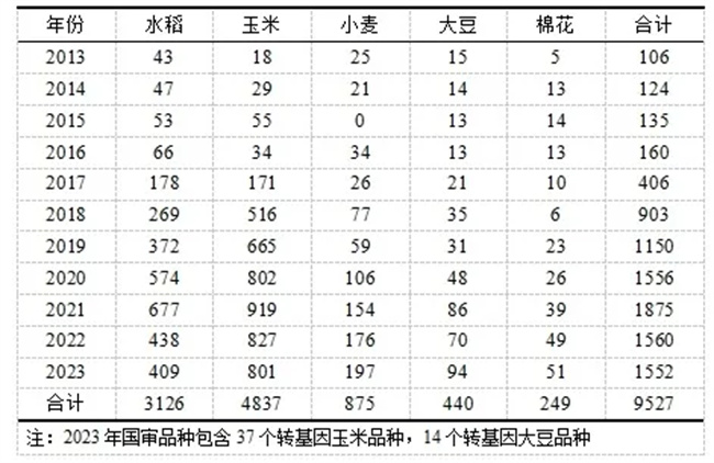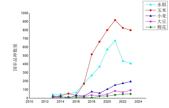 2013-2023年主要農(nóng)作物國家審定品種數(shù)量