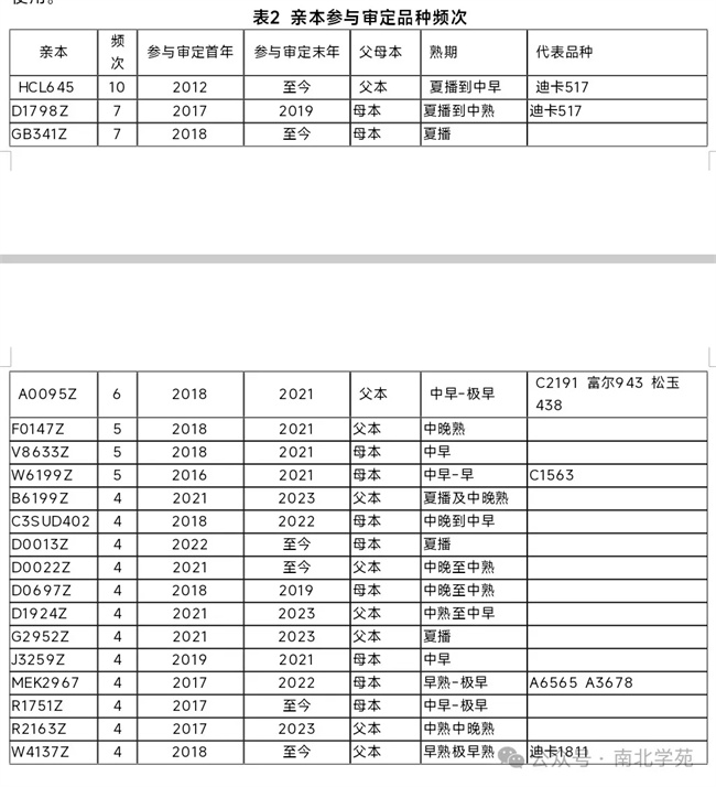 從參與審定的親本使用頻次來(lái)看,有19個(gè)親本參與審定品種4個(gè)以上(表2)。審定品種最多的是迪卡517的父本,多達(dá)10個(gè)以上,至今仍在使用。各個(gè)熟期使用的種質(zhì)不盡相同,但也有部分自交系熟期不是很?chē)?yán)格,有的自交系比如A0095Z可以從中早到極早都有使用。