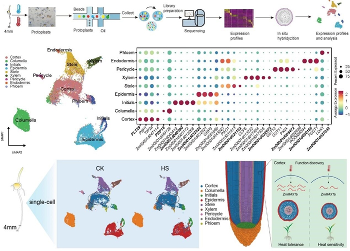 近日,中國農(nóng)業(yè)科學(xué)院生物技術(shù)研究所玉米功能基因組創(chuàng)新團隊首次在單細胞水平解析了玉米根系細胞對熱脅迫的特異性響應(yīng)機制,揭示了熱脅迫下植物根系的細胞異質(zhì)性、根系類型的差異和分化軌跡,鑒定了單雙子葉植物響應(yīng)熱脅迫的關(guān)鍵核心基因,相關(guān)研究成果發(fā)表在《自然通訊(Nature Communications)》上。