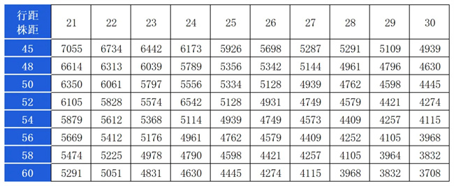 寬窄行方式首先計算出平均行距即可,播種質(zhì)量和除草劑等造成的出苗損失較大時應(yīng)適當(dāng)縮小株距,不間苗。