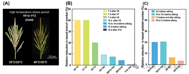 (A)高溫脅迫下玉米雄穗表型受損;(B、C)不同時期高溫脅迫處理下,玉米雄穗分枝數(shù)和小穗數(shù)相對減少的百分比;