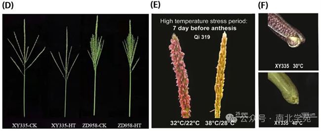 (D)高溫脅迫對玉米雄穗發(fā)育的影響(耐熱ZD958;熱敏感XY335);(E)Qi319在CK(32/22°C)和高溫脅迫(38/28°C)下穎片開放比較圖像;(F)XY335在CK(30°C)和高溫脅迫(40°C)下花藥裂開孔的比較圖像。