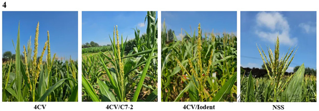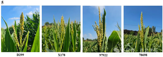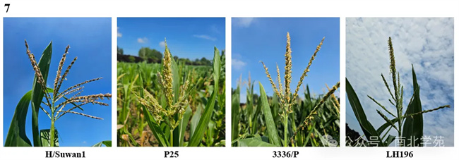 下圖展示的種質(zhì)包括育種家常用系及育種中間材料,從圖中自交系雄穗的表型可以看出,不同血緣類型自交系在高溫?zé)岷γ{迫下雄穗表型差異較顯著。5003、8112、478及7922的雄穗發(fā)育較正常,但散粉困難(圖1)。Z58改良類雄穗分枝及小穗數(shù)量均顯著減少,屬于雄穗發(fā)育異常;昌7-2、昌7-2改良系的雄穗發(fā)育較正常,也可以正常散粉(圖2);DK母本類與DK父本類雄穗分枝及小穗數(shù)量均顯著減少,屬于雄穗發(fā)育異常(圖3)。4CV、4CV/C7-2及4CV/Iodent雄穗發(fā)育較正常,散粉能力較昌7系差,NSS雄穗發(fā)育異常(圖4)。78599選系中的D299及X178雄穗發(fā)育較正常,也可正常散粉,97922及78698選系發(fā)育較正常,但散粉能力較78599選系差(圖5)。X系、黃旅雄穗發(fā)育較正常,但散粉困難,X系、黃旅融入熱源后雄穗發(fā)育較正常,也可正常散粉(圖6)。其他在高溫?zé)岷Νh(huán)境下雄穗表型較正常的種質(zhì)還有H/Suwan1、P25(PB類)、3336/P類、LH196((B73/A632)/(B73/H93))(圖7)。