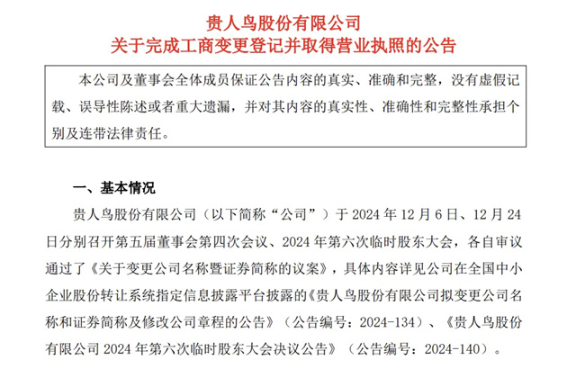 1月10日,貴人鳥股份有限公司發(fā)布公告,宣布其名稱已變更為金鶴農(nóng)業(yè)股份有限公司。目前,新公司已經(jīng)完成工商變更登記手續(xù),并取得營(yíng)業(yè)執(zhí)照。