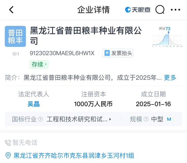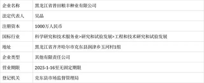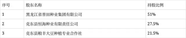 1月16日,黑龍江省普田糧豐種業(yè)有限公司注冊(cè)成立,法定代表人為吳晶,注冊(cè)資本1000萬(wàn)元人民幣,該公司由黑龍江省普田種業(yè)集團(tuán)有限公司、克東縣恒海種業(yè)有限責(zé)任公司、克東縣糧豐大豆種植專業(yè)合作社持股,分別持股51%、27.5%、21.5%。
