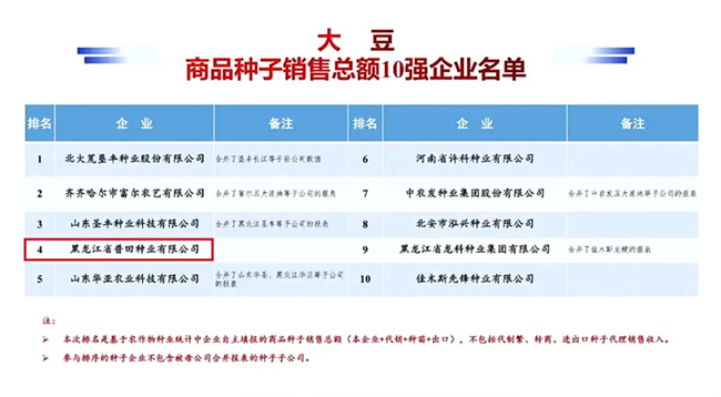2024年的第二十一屆全國(guó)種子信息交流會(huì)上公布了最新的種業(yè)企業(yè)排名,普田種業(yè)再度脫穎而出,連續(xù)6年進(jìn)入常規(guī)水稻商品種子銷售總額前10,大豆商品種子銷售總額步入前5。