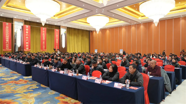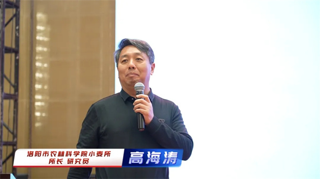 數(shù)載披荊斬棘,一朝厚積薄發(fā)。會上,洛陽市農(nóng)林科學院小麥所所長高海濤研究員結(jié)合自身多年研究成果,深度剖析了“洛麥 45”的特性和強抗倒、穩(wěn)產(chǎn)高產(chǎn)及多抗廣適顯著優(yōu)勢。通過高海濤研究員的詳細講解,參會人員對“洛麥 45”有了更為全面、深入的認識。這不僅讓大家看到了“洛麥 45”的卓越表現(xiàn),更堅定了經(jīng)銷商朋友對這一科技創(chuàng)新成果在未來生產(chǎn)應用中的巨大潛力和推廣前景的信心。