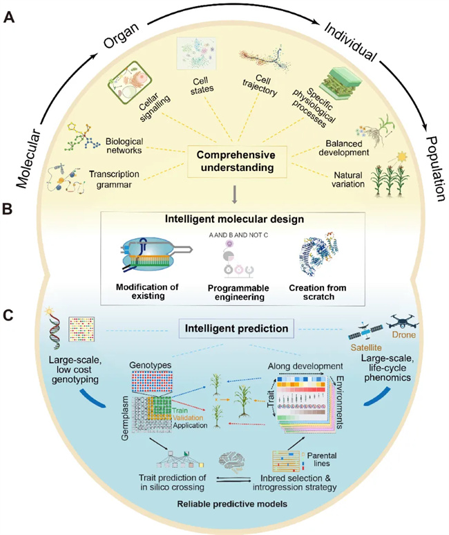 圖2. 智能分子設(shè)計(jì)(A+B)與智能基因組預(yù)測(cè)(C),二者(構(gòu)成細(xì)胞融合的形狀)相結(jié)合可實(shí)現(xiàn)玉米整體育種目標(biāo)的精準(zhǔn)、快速、協(xié)同改良。