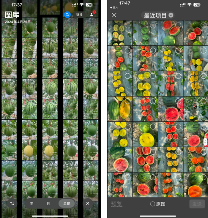 “長(zhǎng)勢(shì)旺不旺、抗病性好不好、植株的整齊度怎么樣、坐果性如何都需要記錄,瓜的照片、植株的照片等都要采集到位。”徐志紅說(shuō)。她的手機(jī)里存著很多西瓜照片,每一天的長(zhǎng)勢(shì)變化都清晰可見(jiàn),簡(jiǎn)直就是一個(gè)西瓜檔案庫(kù)。