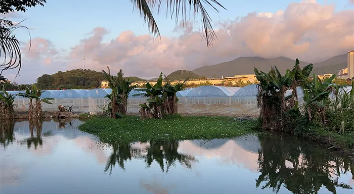 日落時(shí)分,基地的溫度下降了不少。徐志紅引著記者走過(guò)一片魚塘,有幾名工人穿著雨鞋坐在旁邊,拿著淘洗后的瓜瓤引逗小魚。遠(yuǎn)處是隱匿于大片紫色晚霞中的高樓大廈。