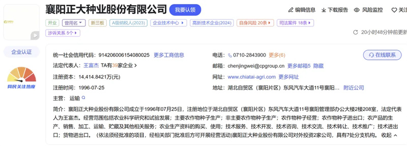 公開信息顯示,正大種業(yè)成立于1996年,注冊資本超1.4億元,是一家主要從事種子研發(fā)、生產(chǎn)、銷售的種子,目前是中國種業(yè)信用骨干企業(yè)成員和國家育繁推一體化玉米種業(yè)企業(yè)。