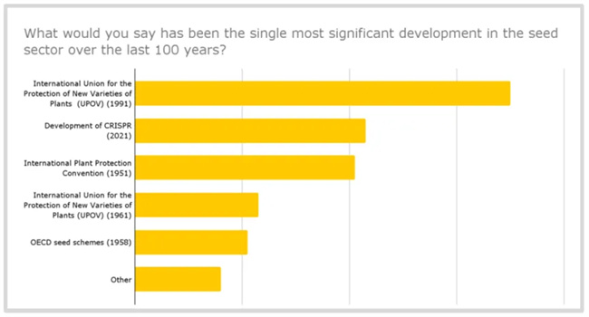 當被問及過去100年種子行業(yè)所取得最大的進步時,有32%的受訪者(共70人)選擇了《國際植物新品種保護聯盟公約》(1991年)的建立,該公約更新了植物育種者的權利內容。10% 的受訪者(共23人)則認為原版公約(1961年)是行業(yè)最大的進步。