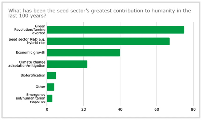當被問及種子行業(yè)在過去100年中對人類的最大貢獻是什么時,最大比例的受訪者選擇綠色革命/避免饑荒,這其中的受訪者占比為34.7%(共75人)。