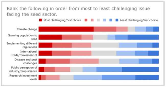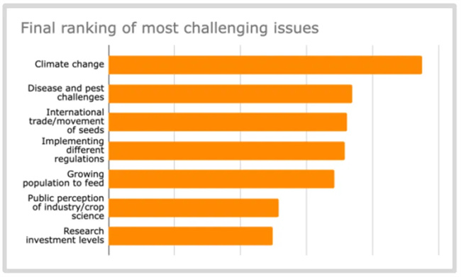 當被要求對種子行業(yè)面臨的最具挑戰(zhàn)性問題進行排名時,44%的受訪者將氣候變化評為首位。其他排名靠前的挑戰(zhàn)包括病蟲害挑戰(zhàn)(這也與氣候變化越來越相關)以及國際貿易/種子流通。