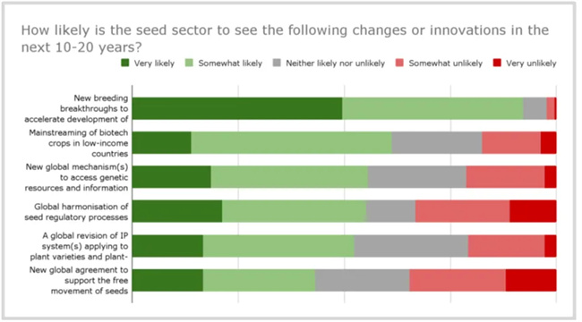 當被問及種子行業(yè)在未來10-20年內會發(fā)生一系列變化或創(chuàng)新的可能性有多大時,新育種技術突破所帶來的良種培育加速被認為是最有可能發(fā)生的事件。其他被認為有可能會發(fā)生的變化或創(chuàng)新包括生物技術作物在低收入國家的主流化,以及獲取遺傳資源和信息,并分享利益的新全球機制。