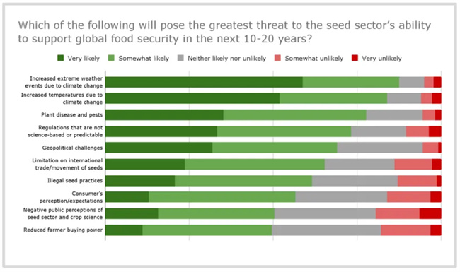 當被問及哪些挑戰(zhàn)將對種子行業(yè)在未來10-20年內支持全球糧食安全的能力構成最大威脅時,前三大威脅都與氣候變化的影響密切相關。其中提到的首要挑戰(zhàn)是由于氣候變化導致的極端天氣事件增加,其次是由于氣候變化導致的溫度升高以及植物病蟲害增加,而氣溫上升則加劇了以上情況的惡化。