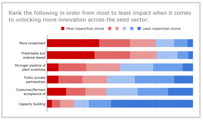 當被問及對推動種子行業(yè)進步最具影響力的變化進行排名時,36%的受訪者對“進行更多投資”這一項的排名最高(注意:這里包括私營和公共部門投資)。其他排名靠前的變化包括可預測的和基于科學的法規(guī)建立以及更多植物科學家的出現。