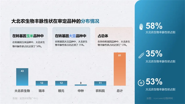在品種審定方面,眾多企業(yè)積極參與并取得了豐碩成果,大北農(nóng)生物表現(xiàn)卓越。兩次審定的品種中,有 37 個玉米品種和 6 個大豆品種應(yīng)用了大北農(nóng)生物豐脈轉(zhuǎn)化體,應(yīng)用了杭州瑞豐轉(zhuǎn)化體的玉米品種 12 個,應(yīng)用了先正達(dá)(中種)轉(zhuǎn)化體的玉米品種 3 個,應(yīng)用了北京糧元轉(zhuǎn)化體的玉米品種 12 個,應(yīng)用了農(nóng)科院轉(zhuǎn)化體的大豆品種 11 個。在轉(zhuǎn)基因玉米品種中,大北農(nóng)生物豐脈性狀占比達(dá)到了 58%,在轉(zhuǎn)基因大豆品種中,大北農(nóng)生物豐脈性狀占比 35%,整體占比約 53%。