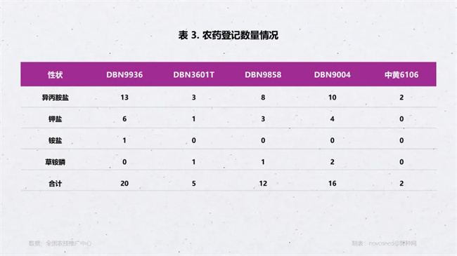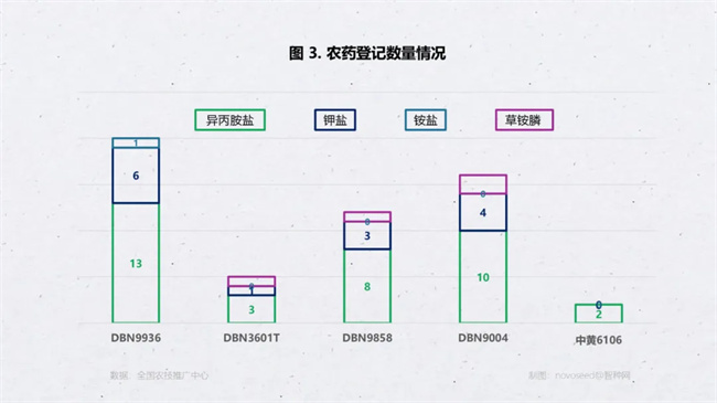 其中在草甘膦方面登記最完善的是 DBN9936,異丙胺鹽、鉀鹽、銨鹽等不同的鹽型均已完成登記;DBN9004、DBN3601T、DBN9858 三個轉(zhuǎn)化體均完成草甘膦與草銨膦兩種除草劑的擴(kuò)作登記;另外,中黃 6106 也完成了 2 個草甘膦異丙胺鹽的擴(kuò)作登記。