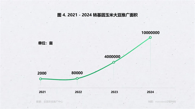 根據(jù)相關(guān)報道分析,2021 年至 2023 年,我國轉(zhuǎn)基因種子的種植面積呈現(xiàn)逐年增長的趨勢。具體來說,2021 年轉(zhuǎn)基因種子的種植面積約為 2000 畝,2022 年增加到8萬畝,而到了 2023 年,這一數(shù)字已經(jīng)躍升至 400 萬畝。2024 年,轉(zhuǎn)基因玉米種植擴(kuò)大至吉林、遼寧、內(nèi)蒙古、河北等8省區(qū),種植面積約 1000 萬畝。