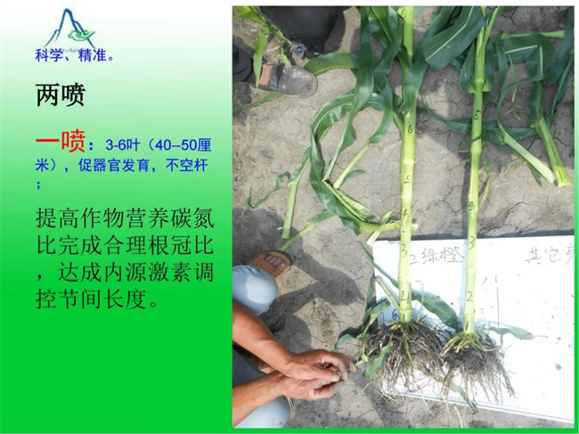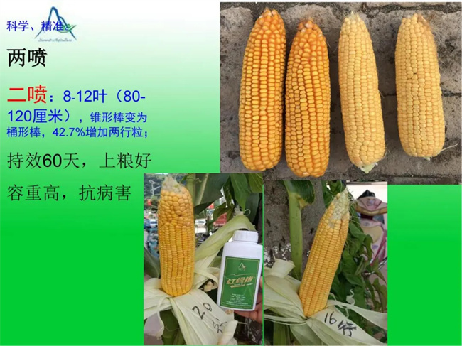 二噴:8-12葉期,代替抑制類控旺劑,抗倒防病,調(diào)節(jié)大小苗,讓錐形棒變桶形棒,補(bǔ)充中后期各種營養(yǎng)并促進(jìn)中后期玉米生長。