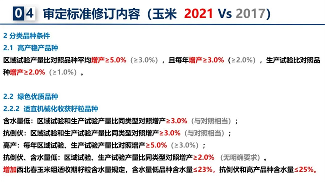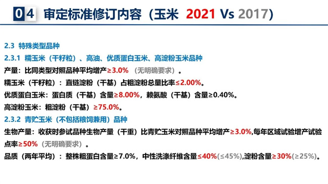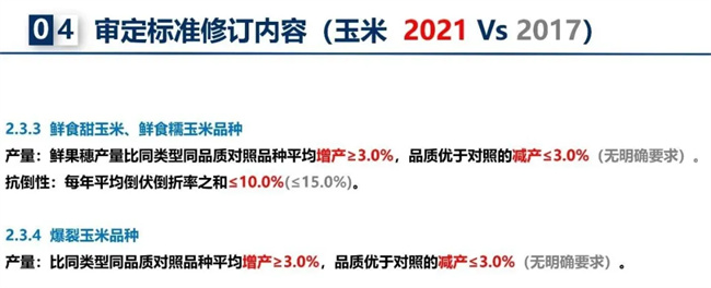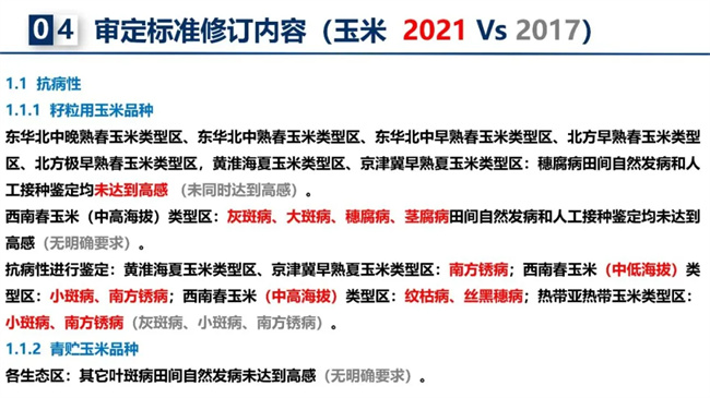 近年來,除農(nóng)業(yè)農(nóng)村部種業(yè)管理司常態(tài)化推進品種審定綠色通道、聯(lián)合體試驗整治和“仿種子”清理工作外,2021年修訂的玉米審定標準的變化,對審定的品種質(zhì)量提出了更高要求。啟動撤銷品種審定,退出一批種性退化失去生產(chǎn)應(yīng)用價值品種、風險問題品種。對比2017年玉米審定標準,2021年修訂帶來哪些變化?