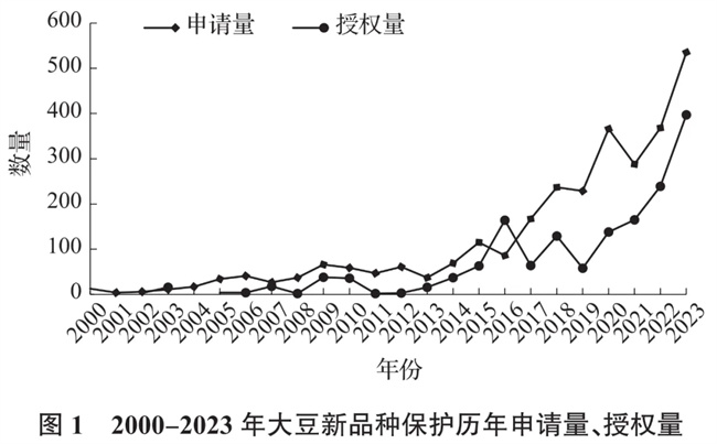 為了減少對進口大豆的依賴,農(nóng)業(yè)農(nóng)村部決定從2019年起實施大豆振興計劃,提高我國大豆產(chǎn)業(yè)質(zhì)量效益和競爭力,這是大豆產(chǎn)業(yè)振興的開端。2022年、2023年連續(xù)兩年中央一號文件都提出要提升大豆和油料的產(chǎn)能工程,提高完善大豆生產(chǎn)者補貼。2024年強調(diào)繼續(xù)實施大豆生產(chǎn)者補貼,鞏固大豆擴種成果,并且要向“高油高產(chǎn)品種”轉(zhuǎn)型。習(xí)近平總書記更是多次強調(diào),要下決心把民族種業(yè)搞上去,抓緊培育具有自主知識產(chǎn)權(quán)的優(yōu)良品種,從源頭上保障國家糧食安全。1997年我國頒布了《中華人民共和國植物新品種保護條例》,植物新品種保護制度正式建立,農(nóng)業(yè)農(nóng)村部累計發(fā)布11批農(nóng)業(yè)植物品種保護名錄,其中大豆于2000年被列入第二批農(nóng)業(yè)植物品種保護名錄。截至2023年底,我國農(nóng)業(yè)植物新品種保護總申請量為76914件,其中大豆的申請量為2920件,位列玉米(24845件)、水稻(18038件)和普通小麥(4817件)后的第4位。本文通過分析2000-2023年大豆申請新品種保護情況,并結(jié)合相關(guān)的政策,分析我國大豆新品種保護發(fā)展趨勢。