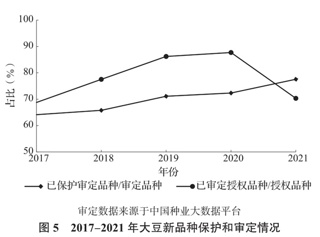 植物新品種保護和品種審定是我國兩種不同的制度,兩者在各自的領(lǐng)域發(fā)揮作用,共同推進我國種子產(chǎn)業(yè)的發(fā)展,但很多大豆新品種即使獲得授權(quán)也沒有在田間推廣應(yīng)用,實際生產(chǎn)中應(yīng)用率不高。本文對2017-2021年5年間的品種保護和審定數(shù)據(jù)進行了交互分析(圖5),發(fā)現(xiàn)在已授權(quán)的品種中,還有一部分品種未通過審定,這可能是為了科研項目等原因而去申請品種保護,并不是為了品種商業(yè)化的需要,也可能是培育出的新品種雖然可以授予植物新品種權(quán),但是暫達不到審定的標(biāo)準(zhǔn),不能進入商業(yè)化推廣階段。2017-2020年大豆品種商業(yè)化逐漸好轉(zhuǎn),授權(quán)品種中已審定品種的占比逐漸增加。此外,在已審定的品種中申請新保護品種的占比逐年遞增但仍低于80%,今后需要進一步加強宣傳,提高育種者的新品種保護意識。