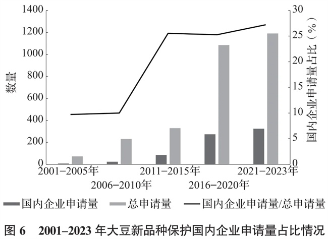 從大豆新品種保護申請主體看,大豆育種主體仍以科研單位為主,企業(yè)參與較少,但根據(jù)申請趨勢和技術(shù)層面分析,未來國內(nèi)企業(yè)申請大豆新品種保護會越來越多。在趨勢方面,以中華人民共和國國民經(jīng)濟和社會發(fā)展五年規(guī)劃為時間節(jié)點,分析從“十五”至“十四五”期間大豆國內(nèi)企業(yè)申請量、總申請量及國內(nèi)企業(yè)申請量占總申請量的變化趨勢(圖6)。國內(nèi)企業(yè)申請量和總申請量變化均呈上升趨勢,國內(nèi)企業(yè)申請量占總申請量整體呈上升趨勢,其比值由9.72%增加到了27.20%,尤其是“十一五”到“十二五”,占比由10%增加至25.53%,主要原因是2011年出臺了《關(guān)于加快推進現(xiàn)代農(nóng)作物種業(yè)發(fā)展的意見》,加大了對企業(yè)育種的政策扶持力度,鼓勵科技資源向企業(yè)流動,建立商業(yè)化育種新機制。“十四五”提出全面深化改革,構(gòu)建高水平社會主義市場經(jīng)濟體制,2021-2023年“十四五”實施進度已過半,企業(yè)占比較2016-2020年增加了1.95%,“十四五”下半場還會激發(fā)各類市場主體活力。此外,在技術(shù)方面,隨著生物育種技術(shù)和雜交制種技術(shù)的發(fā)展,將會吸引更多企業(yè)積極投身于大豆育種的研究中,成為更有活力、創(chuàng)造力和競爭力的申請主體。