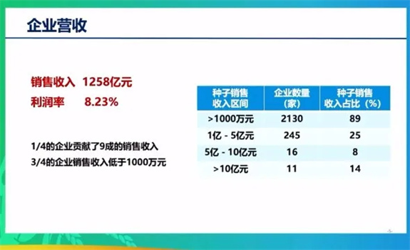 從企業(yè)的營收看,2023年全國種業(yè)企業(yè)共實現(xiàn)種子銷售收入1,258億元,平均的利潤率8.23%,1/4企業(yè)貢獻(xiàn)銷售收入的9成, 3/4的企業(yè)銷售收入低于1,000萬元。具體來看,銷售收入超過1,000萬元以上的企業(yè)有2130家,占種子銷售收入的89%;1億元到5億元的企業(yè)有245家,占種子銷售收入的25%;5億元到10億元的企業(yè)16家,占種子銷售收入的8%;超過10億元的企業(yè)11家,占種子銷售收入的14%。
