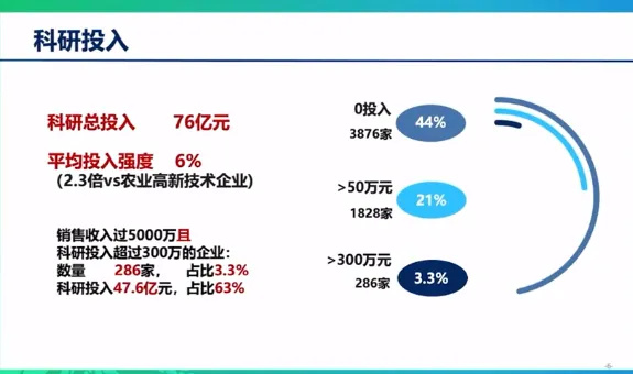 從科研投入看,全國種業(yè)企業(yè)的科研總投入76億元,平均投入強(qiáng)度6%。這一數(shù)據(jù)是農(nóng)業(yè)高新技術(shù)產(chǎn)業(yè)企業(yè)的2.3倍,這也體現(xiàn)了種業(yè)是高科技的產(chǎn)業(yè),是農(nóng)業(yè)的芯片。但是,也可以看出有3876家企業(yè)沒有研發(fā)投入,研發(fā)投入超過50萬元的種業(yè)企業(yè)有1828家,占比21%;銷售收入超過5,000萬元,并且科研投入超過300萬元的企業(yè)有286家,占比3.3%。