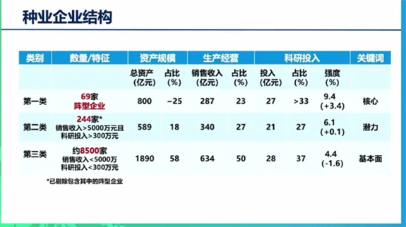 第一類是69家國家農(nóng)作物種業(yè)陣型企業(yè),這69家陣型企業(yè)總資產(chǎn)規(guī)模800億元,比2022年增加176億元,占行業(yè)總值的近1/4,優(yōu)勢地位十分的突出。種子銷售收入287億元,種子銷售毛利潤96億元,凈利潤24億元,分別占行業(yè)總值的23%、30%和23%,科研總投入27億元,超過全國總值的1/3,投入強(qiáng)度9.4%,較6%的行業(yè)平均值高3.4個百分點。這些企業(yè)是我國種業(yè)發(fā)展的核心,要集中資源力量,重點支持培育農(nóng)業(yè)領(lǐng)軍企業(yè),打造國家農(nóng)業(yè)科技戰(zhàn)略力量。