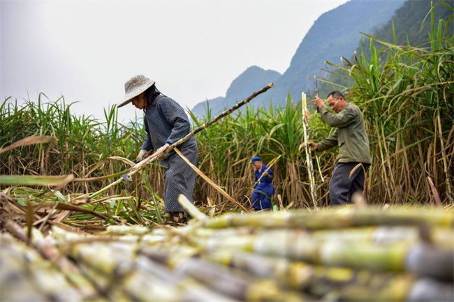 蔗農(nóng)們正忙著收割甘蔗。記者 黃少將 攝