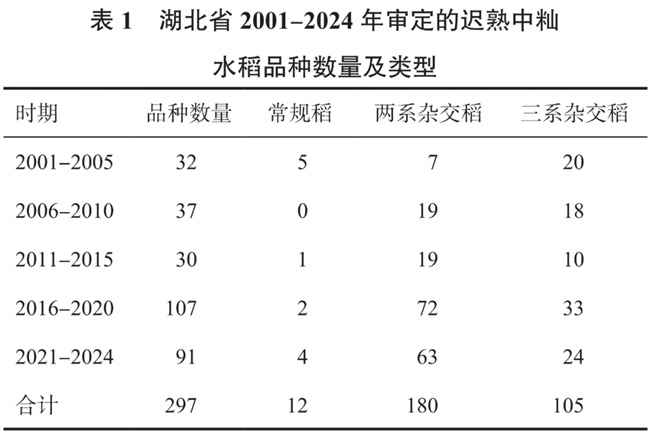 湖北省地處長江中下游,具有良好的農(nóng)業(yè)生態(tài)環(huán)境和發(fā)展優(yōu)勢,素有“魚米之鄉(xiāng)”的美譽(yù),是全國重要的糧食生產(chǎn)基地之一。水稻是湖北第一大糧食作物,常年種植面積在226萬hm²以上,產(chǎn)量在1850萬t以上,占全省糧食種植面積和總產(chǎn)量的50%和70%,主要以中稻(含一季晚稻)為主,種植面積近200萬hm²,其產(chǎn)量占水稻總產(chǎn)量的90%,遲熟中秈類型品種占據(jù)了湖北省水稻生產(chǎn)的主導(dǎo)地位。種子是農(nóng)業(yè)的“芯片”,良種是保障糧食安全和重要農(nóng)產(chǎn)品有效供給的根基,是確保中國人的飯碗牢牢端在自己手中的關(guān)鍵抓手。隨著品種管理制度的完善和育種水平的提升,水稻品種類型不斷豐富,品種數(shù)量日益增多,為農(nóng)業(yè)生產(chǎn)提供了更多的選擇。為了解21世紀(jì)以來湖北省審定的遲熟中秈水稻品種信息,助力水稻品種培育和產(chǎn)量提升,本文整理了2001-2024年湖北省審定的遲熟中秈水稻品種的相關(guān)資料,對其類型、選育單位、主要農(nóng)藝性狀、米質(zhì)、稻瘟病抗性等進(jìn)行分析,以期了解湖北省審定的遲熟中秈水稻品種主要性狀的變化趨勢,為今后湖北省中稻品種的選育和品種管理提供理論參考。
