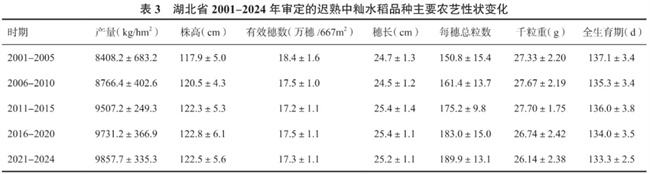 2001-2024年湖北省審定的遲熟中秈水稻品種平均產(chǎn)量穩(wěn)步增長,每hm²平均產(chǎn)量由8408.2kg增長到9857.7kg,增加了1449.5kg,增幅17.2%(表3)。湖北省審定的遲熟中秈水稻品種產(chǎn)量水平的不斷提高主要得益于每穗總粒數(shù)的持續(xù)增多,由150.8粒穩(wěn)定增長到189.9粒。其他農(nóng)藝性狀中,全生育期天數(shù)略有減少,由137.1d減少至133.3d,株高、有效穗數(shù)、穗長、千粒重變化相對不明顯。