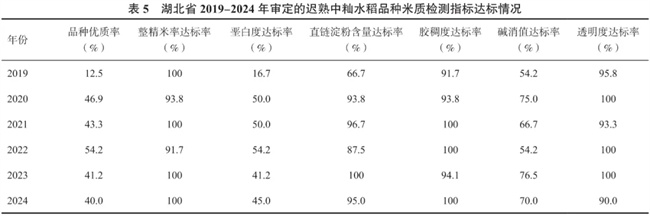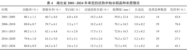 由表4可知,2001-2024年湖北省審定的遲熟中秈水稻品種有132個(gè)米質(zhì)達(dá)到國標(biāo)優(yōu)質(zhì)三級或部標(biāo)三級及以上,占比44.4%;審定品種的優(yōu)質(zhì)率以2006-2010年最高,為78.4%,其次是2011-2015年,為63.3%;2016-2020年審定品種的優(yōu)質(zhì)率最低,為27.1%,可能是因?yàn)?006-2015年審定了多個(gè)由廣占63S(含廣占63-4S)、培矮64S配組的品種,品種米質(zhì)優(yōu),提升了湖北省遲熟中秈水稻品種的優(yōu)質(zhì)率,并且2016年、2018年的高溫天氣導(dǎo)致當(dāng)年參試品種米質(zhì)較差。
