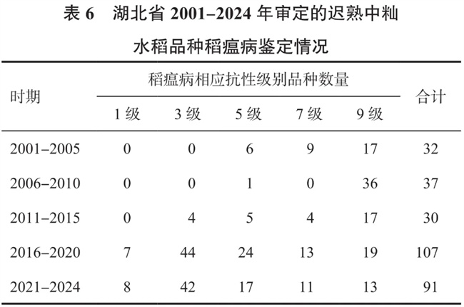 稻瘟病是水稻生產(chǎn)的重要病害,由表6可以看出,2001-2010年湖北省審定的遲熟中秈水稻品種稻瘟病抗性級別以9級、7級為主,沒有抗稻瘟病品種通過審定,2011-2015年審定了4個(gè)稻瘟病抗性級別為3級的品種,2016-2024年審定了101個(gè)稻瘟病抗性級別為1級、3級的品種,占比51%,稻瘟病9級的品種逐漸減少,表明湖北省審定的遲熟中秈水稻品種稻瘟病抗性明顯提高。