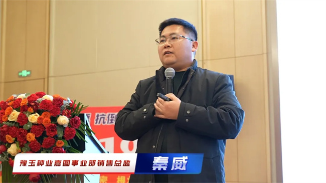 圍繞央玉118品種優(yōu)勢(shì)及公司強(qiáng)大實(shí)力,豫玉嘉圖事業(yè)部總監(jiān)秦威詳細(xì)介紹了抗逆能力強(qiáng)、綜合抗性好、產(chǎn)量高的央玉118市場(chǎng)競(jìng)爭(zhēng)優(yōu)勢(shì)及廣闊的推廣前景。全面闡述公司強(qiáng)大的科研實(shí)力、先進(jìn)的經(jīng)營(yíng)理念及高質(zhì)量種子把控能力和為各位合作伙伴提供穩(wěn)健發(fā)展的保障能力。他說(shuō),央玉118從審定當(dāng)年的1萬(wàn)袋到2024年度的200萬(wàn)袋,除了品種自身優(yōu)勢(shì)外,離不開(kāi)各位伙伴的辛勤付出和對(duì)公司工作的大力支持。談到央玉118發(fā)展規(guī)劃,秦總在會(huì)上表示,2025年,是央玉118是實(shí)現(xiàn)銷(xiāo)量倍增關(guān)鍵之年,希望大家同心戮力,早謀劃,早部署,早行動(dòng),早日實(shí)現(xiàn)2025—2026年400萬(wàn)畝訂單,也為2026—2027年突破1000萬(wàn)畝宏偉目標(biāo)開(kāi)好頭,起好步。最后他呼吁,攜手嘉圖,共展宏圖!