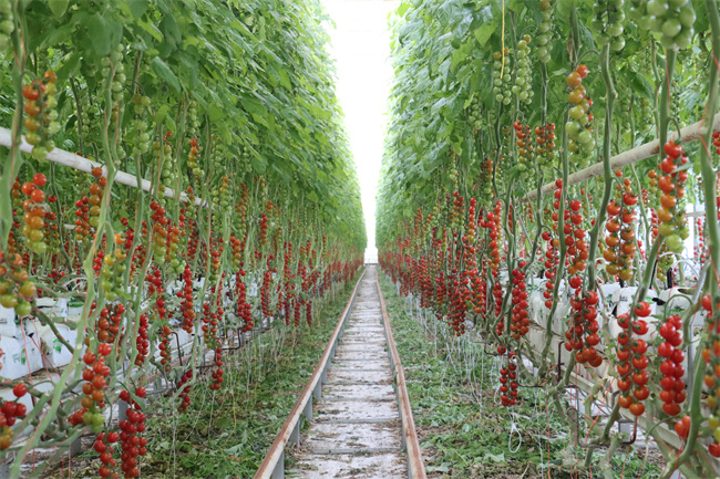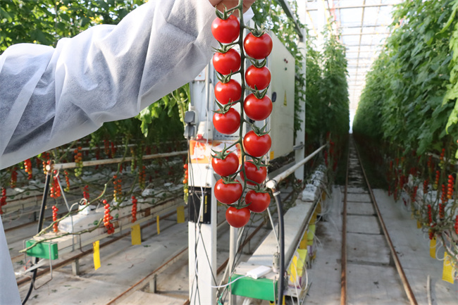 串收番茄之所以如此特別,得益于獨(dú)特的種植技術(shù)和先進(jìn)的溫室設(shè)施。連棟玻璃溫室里,高度更高,透光性更好,為番茄的生長提供了理想的光照和溫度條件。