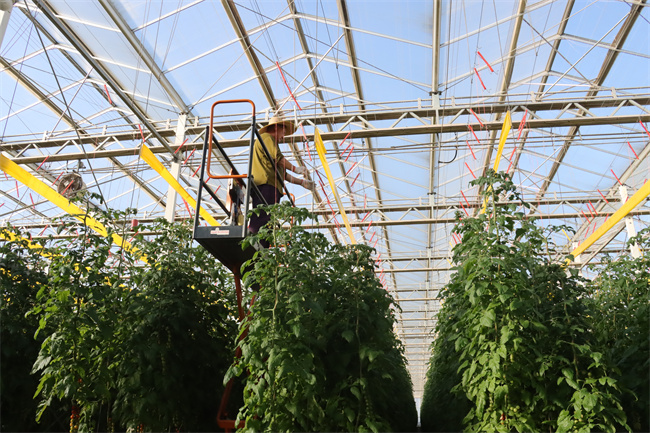 在溫室內(nèi),看不到一粒土壤,取而代之的是整齊排列的種植槽。這些種植槽內(nèi)填充著少量的基質(zhì),為番茄根系提供了穩(wěn)定的生長環(huán)境。每天,專業(yè)的工作人員都會(huì)精心監(jiān)測溫室內(nèi)的溫度、濕度和灌溉情況,確保番茄在最適宜的環(huán)境中生長。同時(shí),他們還會(huì)利用升降機(jī)進(jìn)行剪枝和落枝工作,確保番茄植株的通風(fēng)透光,提高產(chǎn)量和品質(zhì)。