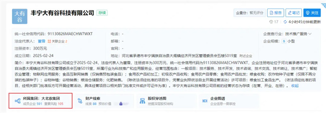 企查查官網(wǎng)顯示,近日,豐寧大有谷科技有限公司成立,經(jīng)營范圍涵蓋智能農(nóng)業(yè)管理、農(nóng)作物種子經(jīng)營等。企查查股權(quán)穿透顯示,該公司由北京大有谷科技集團有限公司100%全資持股,而北京大有谷科技集團有限公司則是由大北農(nóng)全資持股。公司歸屬集團為大北農(nóng)集團。