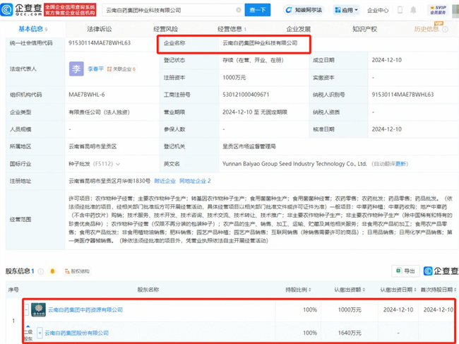 2024年12月,云南白藥跨界成立種業(yè)科技公司——云南白藥集團種業(yè)科技有限公司,法定代表人為李春平,注冊資本1000萬人民幣。