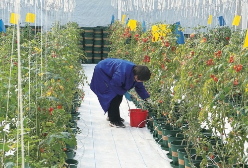 在農(nóng)作物育種加速器中,工作人員正在為番茄修剪枝葉。
