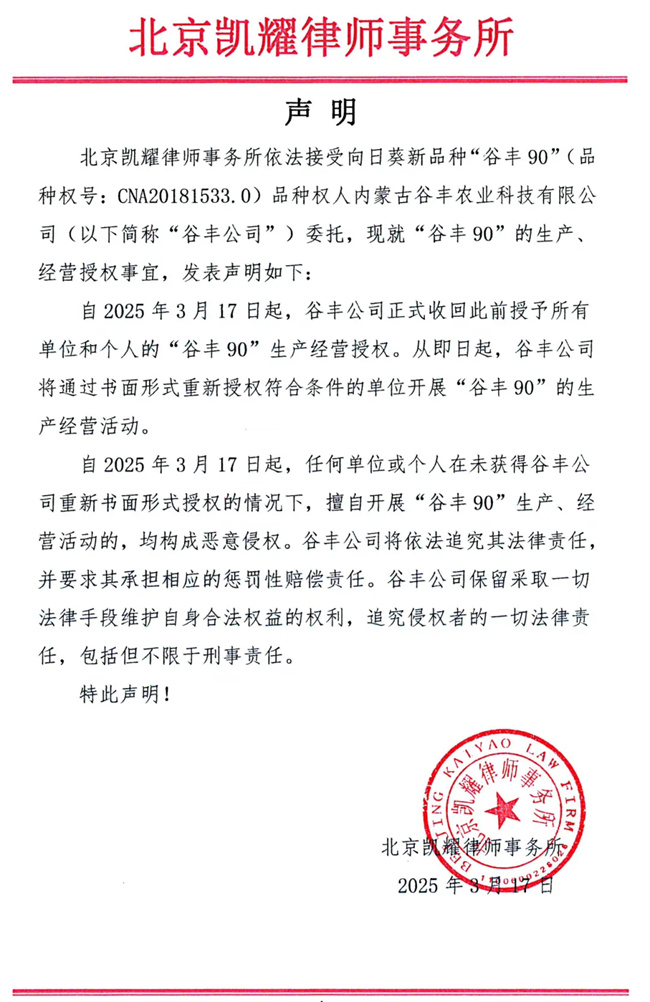 北京凱耀律師事務(wù)所依法接受向日葵新品種“谷豐90”(品種權(quán)號(hào):CNA20181533.0)品種權(quán)人內(nèi)蒙古谷豐農(nóng)業(yè)科技有限公司(以下簡(jiǎn)稱“谷豐公司”)委托,現(xiàn)就“谷豐90”的生產(chǎn)、經(jīng)營授權(quán)事宜,發(fā)表聲明如下: